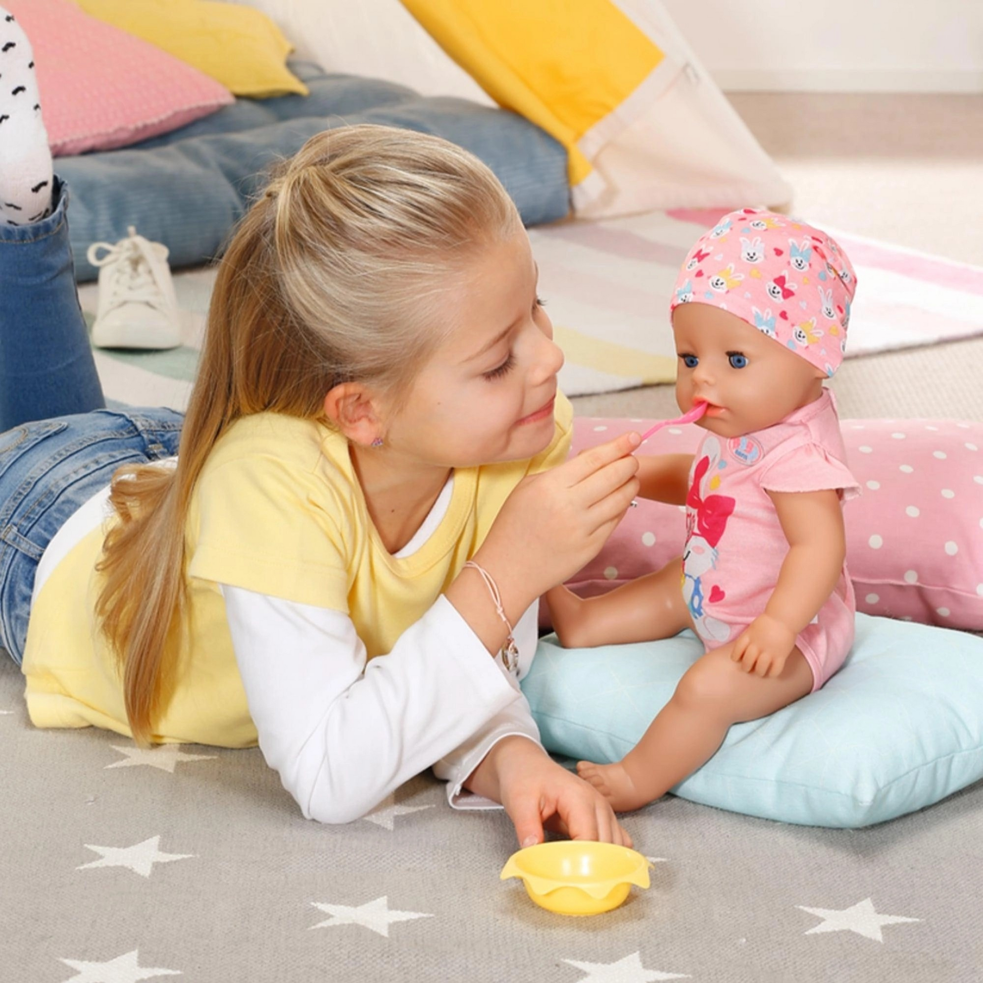 She loves to drink water from her bottle. Then she can do a wee in her nappy or potty, and cry real tears. As well as drinking water, BABY born can also eat porridge. Then she even does a number two.