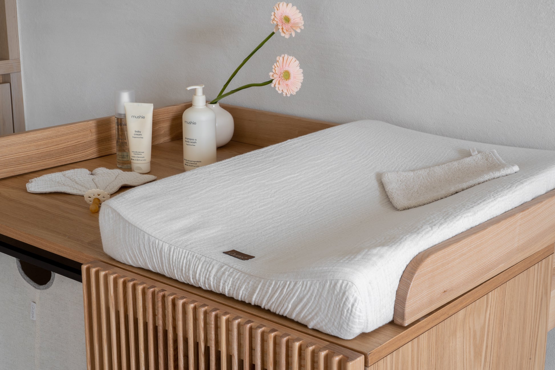 The legs and doors are made of solid ash wood, while the panels are constructed from ash-veneered MDF. You can equip the dresser with practical storage baskets (ref. 65MM013-CRC). Additionally, the dresser can be transformed into a practical changing table with the addition of the extension (ref. 76 16 HNK03E) or its XL variant (ref. 76 16 HNK03EXL).For maintenance, we recommend regularly cleaning with a damp cloth to keep the materials in optimal condition.
