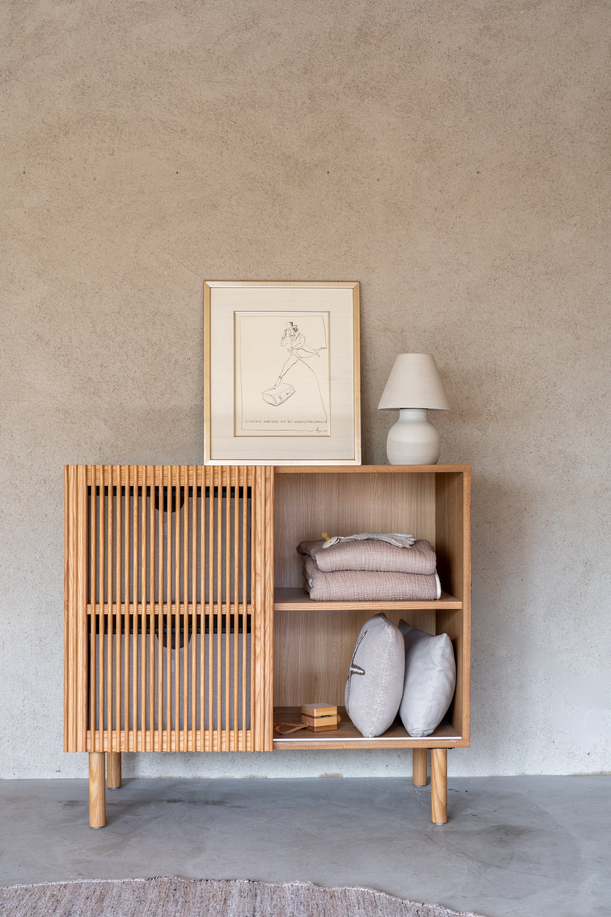 The legs and doors are made of solid ash wood, while the panels are constructed from ash-veneered MDF.