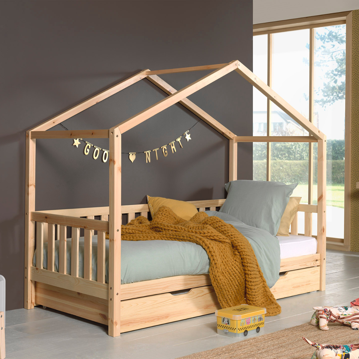 VIPACK DALLAS European single house shaped day bed 90 X 200cm with fence natural