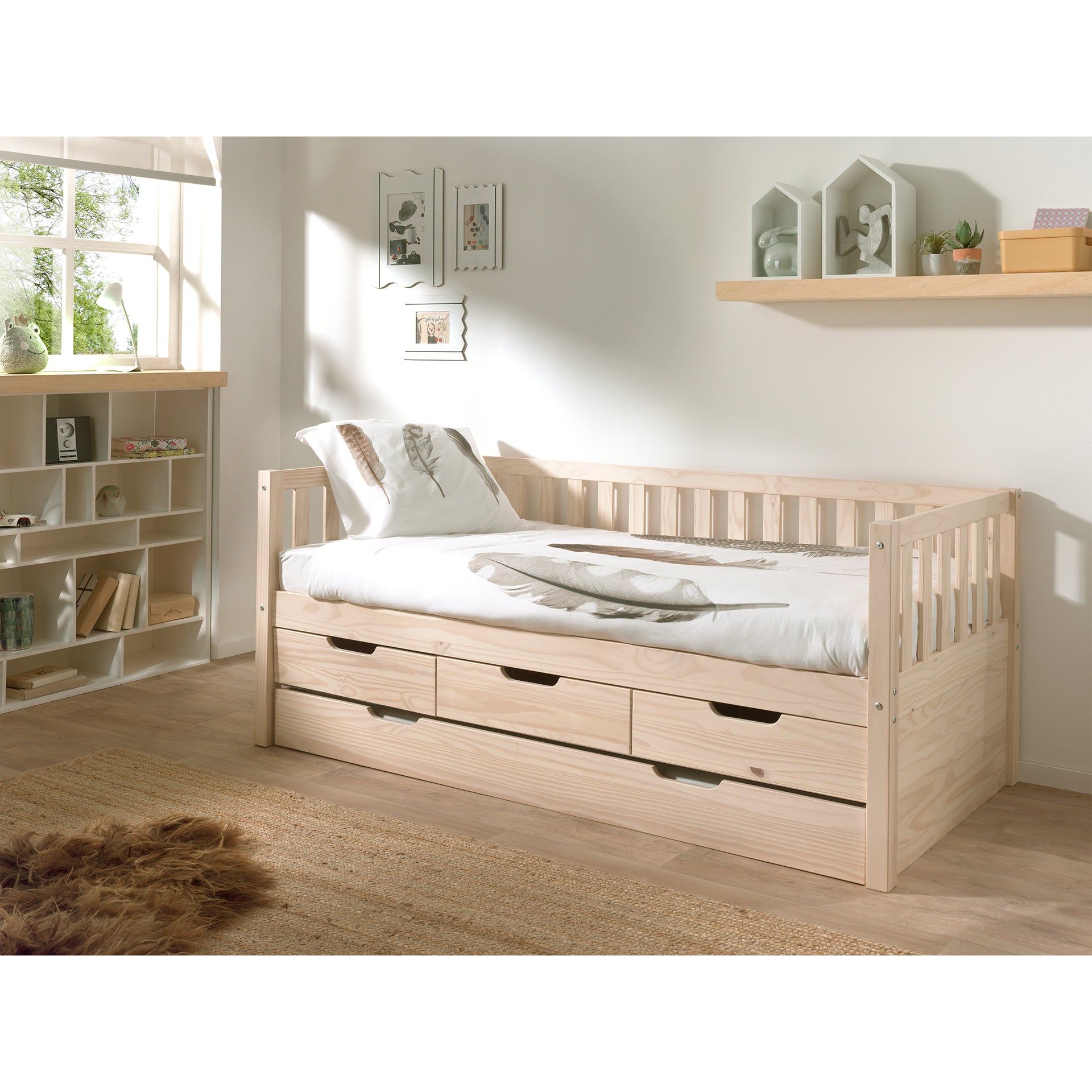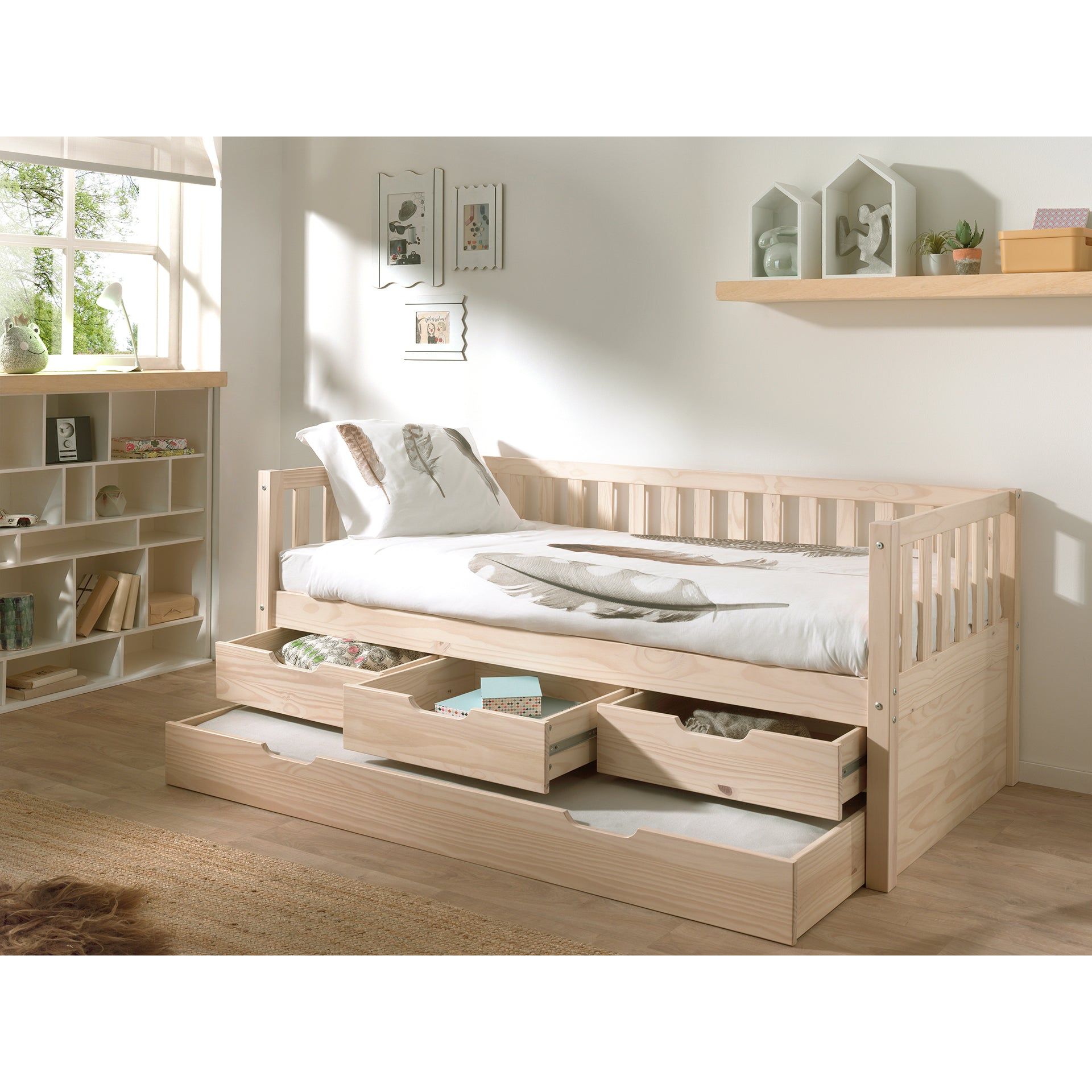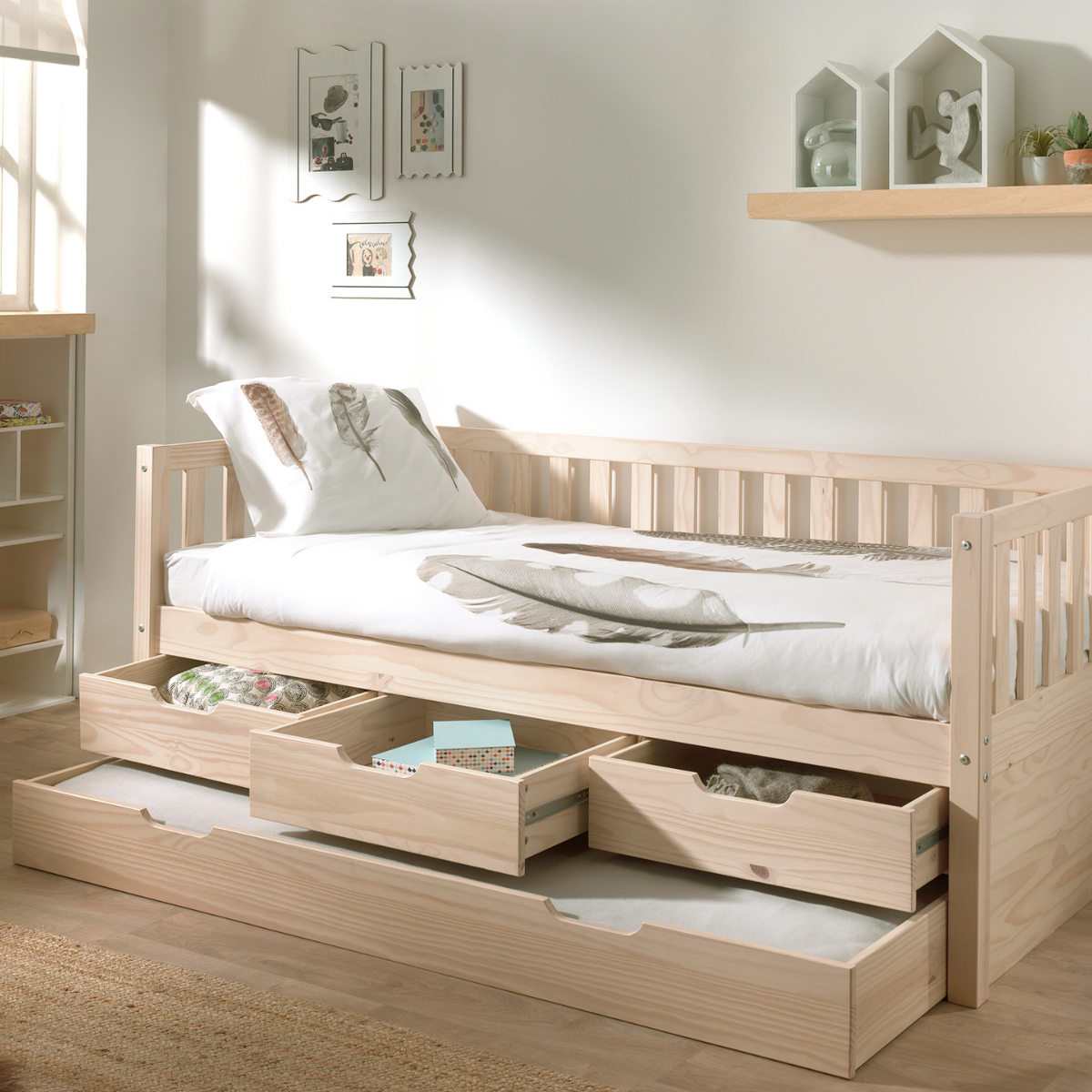 - Materials: Under bed drawers made from solid pine.