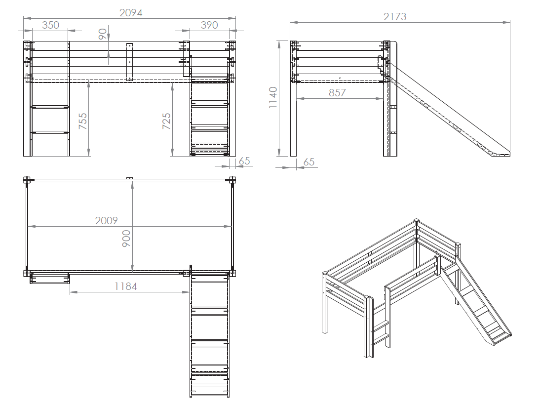 The VIPACK PINO European single mid-sleeper with slide is made of solid pine and has a natural finish. The ladder can be mounted on either the left or right side. The slatted base is included. The all-round fall protection, wide steps and good stability make this bed very safe. The space under the bed can be used for playing or as storage space. There are various options available in the PINO range to supplement this bed with a desk, library, chests, hanging shelf or nice textile set.